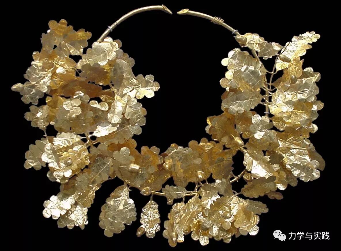 金、银的比重是19.3和10.5。已出土的桂冠最重714g(图1),但可能有少量叶片脱落。设桂冠重1000g,若为纯金则体积51.8cm3;若含有30%的银,则体积64.8cm3,增大13cm3。容纳金冠的水盆其直径为20cm,面积为314cm2,则浸入金块或金冠引起的水面高度变化分别是0.165cm和0.206cm,相差仅0.041cm,难以测量或觉察;而以溢出法直接测量体积,因水表面张力所引起的液面凸起在20°C时可达到0.385cm,同样难以确定金冠与纯金的体积差异。更为重要的是,上述测量方法没有固体受力的因素,似乎不能引伸出浮力定律。