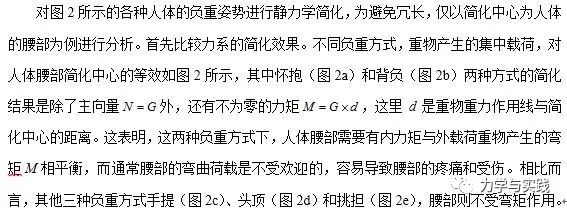 2)必要受内力的部分,载荷更小。以人体的支柱部分—脊柱为例,不管何种负重方式,它所受的静压力都近似等于外载荷。但只有压力载荷,无弯矩载荷,显然对腰部肌肉而言更轻松。