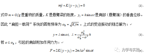 由以上文献[2]中的力学模型分析可知,扁担的问题是一个弹性系统的受迫振动问题。产生的载荷是典型的动载荷,与系统本身的特性密切相关(K,),而且对激励频率很敏感(与成正比),文献[1]因此也指出,人的步行频率不能太高,否则增加动反力幅值。
